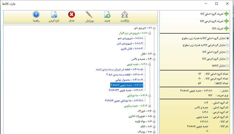 با جابجایی روی هر کدام از گزینه های قسمت دوم سمت راست جدول "نمایش گروه اصلی کالا به همراه زیر سطوح"، "نمایش گروه فرعی کالا به همراه زیر سطوح" و ... میتوان نحوه مشاهده چارت کالا ها را بر اساس نیاز تغییر داد. با رفتن روی هر کالایی میتوان اطلاعات اجمالی آن کالا را در سمت راست پنجره ملاحظه کرد.